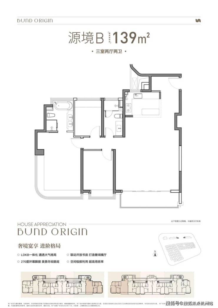 B户型是3房2厅2卫格局,三开间朝南+LDKB一体化+奢阔宽厅+全卧室带飘窗+主卧套房设计+动静分离+主卧270度飘窗,舒适度更高。