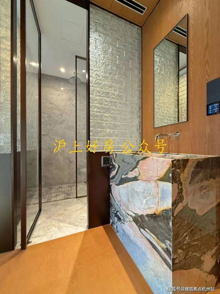 基础硬件都不差,项目在审美上还做了不少创新——卫生间大量采用奢石和石材,比如主卫柜体墙面就是香格里拉翡翠拼花,龙头是冷热分离式,成本更高: