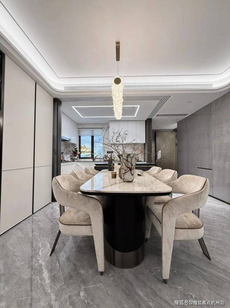 超尺度“洄游聚厅”打破传统壁垒,以餐客厨一体化方厅重构家庭社交中心。南向巨幅落地窗引景入室,无论是三代同堂的温馨飨宴,抑或名流雅士的私密沙龙,皆可从容铺展气度。