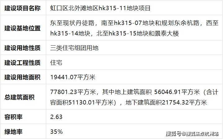 虹口北外滩地区hk315-11地块新建住宅项目,位于虹口区北外滩核芯区,东至现状丹徒路,南至hk315-07地块和规划东余杭路,西至hk315-14地块,北至hk315-15地块和景泰大楼。总建设用地面积约19441平方米,计容建筑面积约51130平方米。