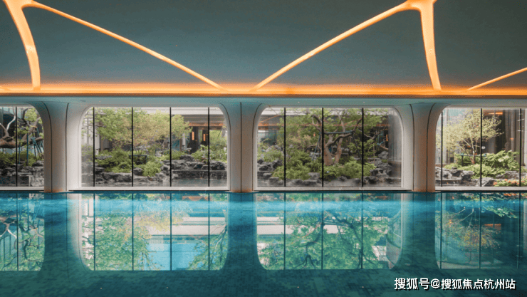约500㎡艺术馆般泳池,天花、墙面以现代摩登的手法,抽取上海海派建筑造型为元素,打造充满静奢韵律的造型,搭配泳道尽端景泰蓝奢石背景墙,勾勒出一处臻享静美的精神之所。