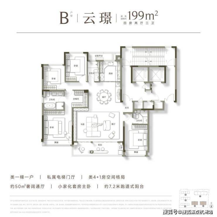 高层均为建面约199㎡的大平层户型,极致纯粹的业主圈层,带来更为尊贵的居住体验。其户型设计尽可能扩宽南向开间的同时,展现出了极为阔绰的空间尺度,足以满足多代同堂的居住需求,成为众多购房家庭终极改善的首选。