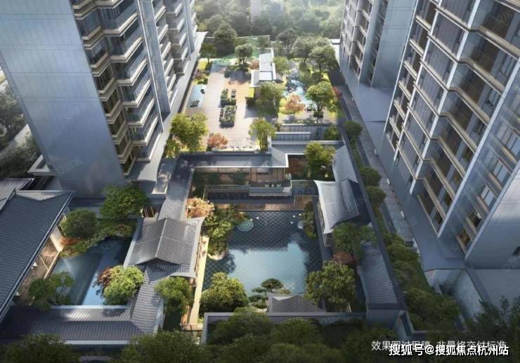 采用“王府中式”设计,大门为歇山顶形制(宽53米、高近11米),配黄铜狮、罗汉松及蓝翡翠奢石。园林融入西湖十景元素,如“花港观鱼”水景、“柳浪闻莺”绿植,并设雾森系统首层单元门厅石材铺就,肌理沉稳。