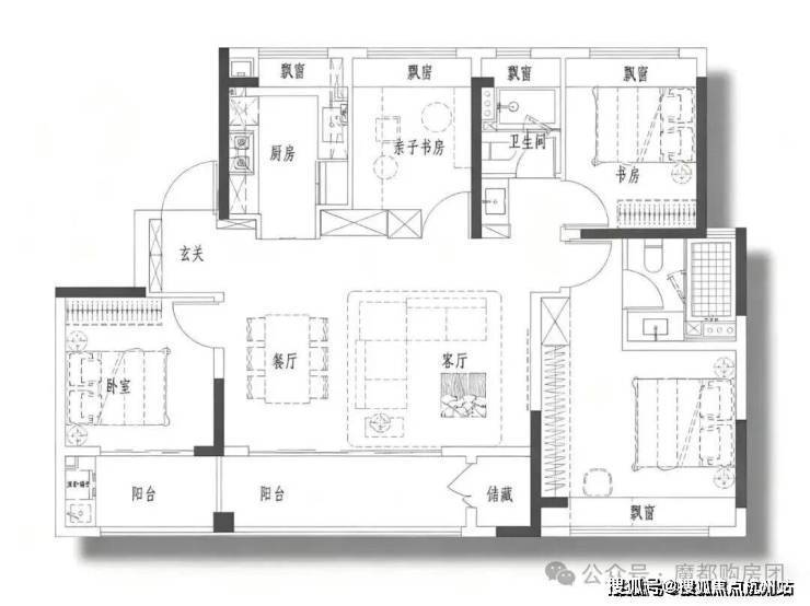 三开间朝南,搭配多处飘窗和阳台,能充分引入自然光线,使室内空间明亮通透,同时也能带来较好的景观视野.
