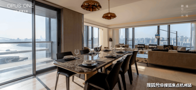 这客厅既是 270°全景舱厅 ,无论全家在餐桌前欢聚一堂,还是孩子们在客厅嬉戏,一抬头便是以江景和城市为主题的巨幅油画。