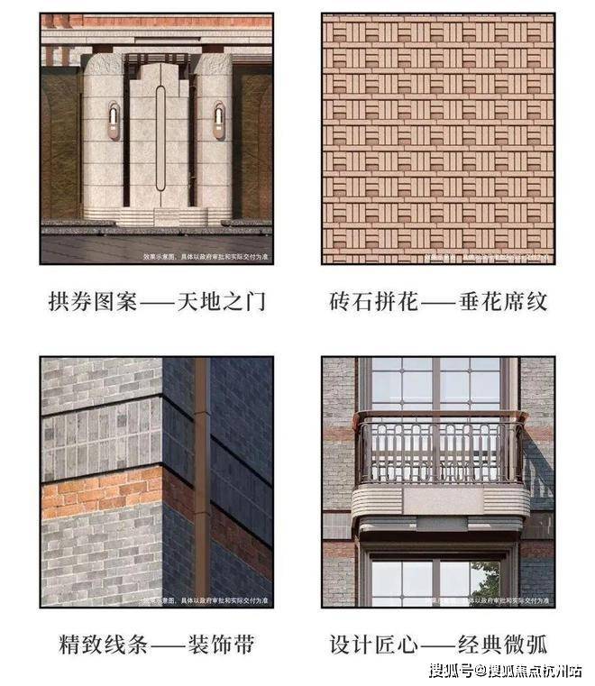 在建筑风格上,项目运用了4大新精致图案,从拱券图案、砖石拼花再到引入了文艺复兴建筑经典手法——刻槽技术,打造建筑装饰带,运用石库门椭圆造型元素,打造前沿建筑符号!