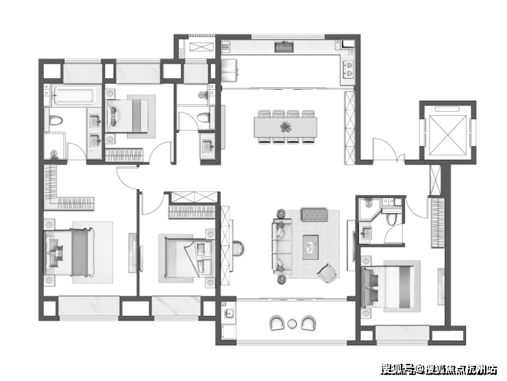 雍雅双套房 ,主卧卫浴双台盆,L型衣帽间,质感十足; 全屋6飘窗 ,最大化采光观景视野,舒享格调时光;