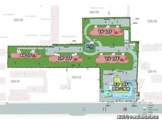 根据设计方案显示,项目拟建三栋17层商品住宅、一栋5层商品住宅、一栋18层公租房、自持租赁住宅及配套楼(其1-2层为菜场)和一栋1层的KT电站,并设置2层地下车库。在三门路设置机动车出入口、消防应急出入口及人行出入口。