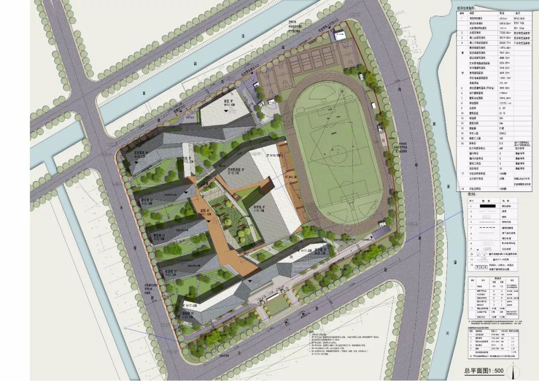 学校拟规划51个班级,总建筑面积77200.85㎡,其中地上建筑面积59219.85平方米(计容面积55260.77平方米)。容积率0.89,建筑密度25.7%,绿地率35%,机动车位513个。
