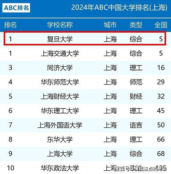 根据认可度、权威性更高的2024年ABC中国大学排行榜,2024年复旦 位列上海第1,全国第5。