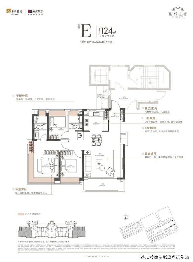 建面约124㎡3房2厅2卫,八批次总价约596-693万, 同样是经典的动静分离户型,属于改善型3房,各空间居住舒适度更强,该户型均为边套,主卧为270°转角飘窗;
