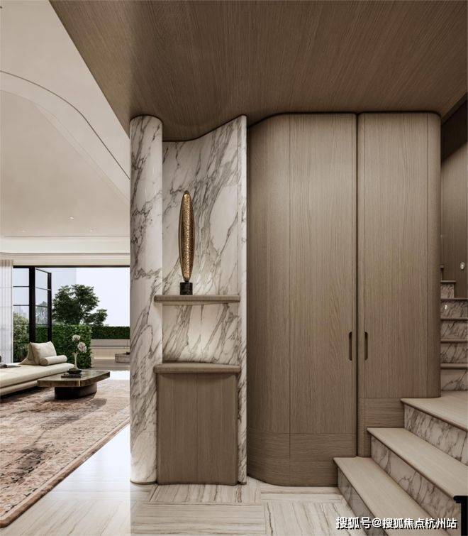 参考过往样板间,项目进门右手是一整盘玄关柜,含S墙在内的通顶柜体,可以收纳各类生活物品,鞋子、行李箱、杂物等做了很多分区。其中玄关置物台还是带奢石的,点缀其中。