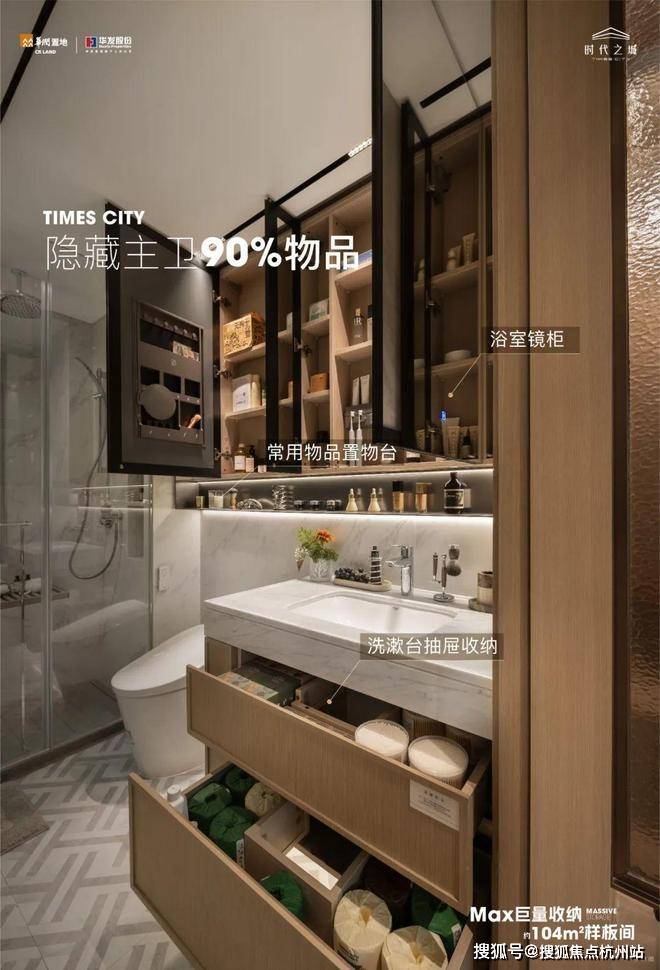 主卫更是做了通长镜柜和置物台,两大镜柜+一个美妆冰箱,内置牙刷清洁器、插座、化妆工具插槽等分区。