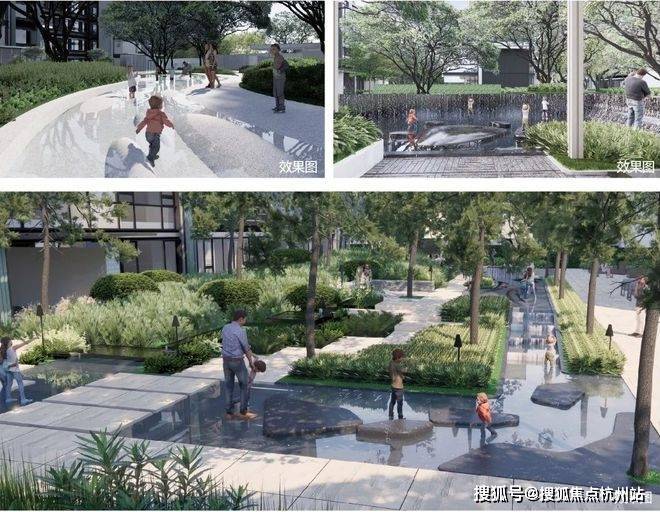 在细节营造方面方面,项目打造 “社交花园、睡莲花园、森之花园、流水花园、童趣花园、水岸花园、时光花园” 共七大活力主题花园,穿插在楼宇之间,定制每一栋独特的生活场景。同时还营造了三片戏水活力场,随着社区水流的流淌, 形成“溪谷、悬瀑、落泉”不同的水景剧场。 让生活场景向水而生,并逐渐向园林渗透,最终融入其中,形成水与景的和鸣之势,营造自然之上的意境。