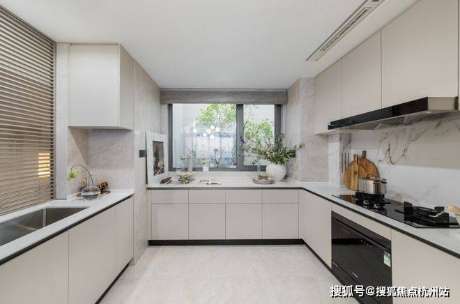 进入厨房,燃气灶、油烟机,洗碗机、水槽龙头等大牌精装一应俱全。
