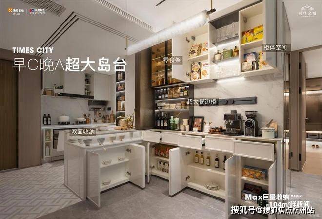 换个角度看,厨房岛台面向餐桌的一侧也做了收纳柜,还预留了空间可打造超大的餐边柜。