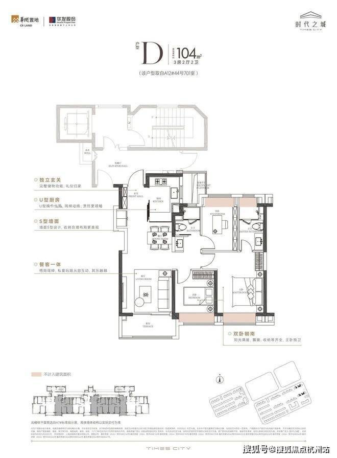 建面约104㎡3房2厅2卫,八批次总价约507-585万, 经典动静分离户型,三开间朝南,独立玄关,U型厨房,预留分户S墙设计,可释放厨房冰箱空间!从最新开放的104户型样板间可以看出,项目对新品户型的收纳储藏空间做了全维升级,实用性更强。