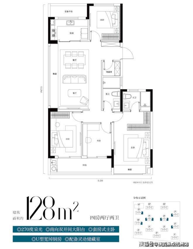 建筑面积约128㎡四房两厅两卫户型,采用“4+1”房设计,满足二胎家庭或三代同堂的居住需求,更比同类面积多了一个储藏空间。三房朝南,餐客厅尺度完全媲美140方以上户型,并且还有一个储藏间,非常贴近二孩家庭或者三代同堂家庭的需求。