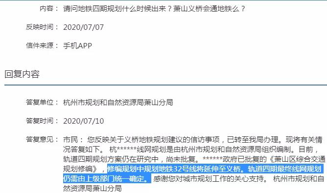 另外杭州规划和自然资源局萧山分局的信访中,也对居民提出的相关问题进行了回复,回复中提到规划地铁32号线延申至义桥。轨道四期最终网规划仍需上级部门统一确定。
