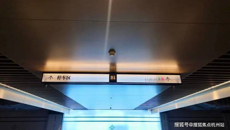 步入地库内部,视线瞬间被彻底打开。顶部采用长达约3米的蜂窝铝板与铝方通格栅铺陈,线性灯带像光流般贯穿其中,让整个空间具备了“酒店式下沉大堂”的仪式感。