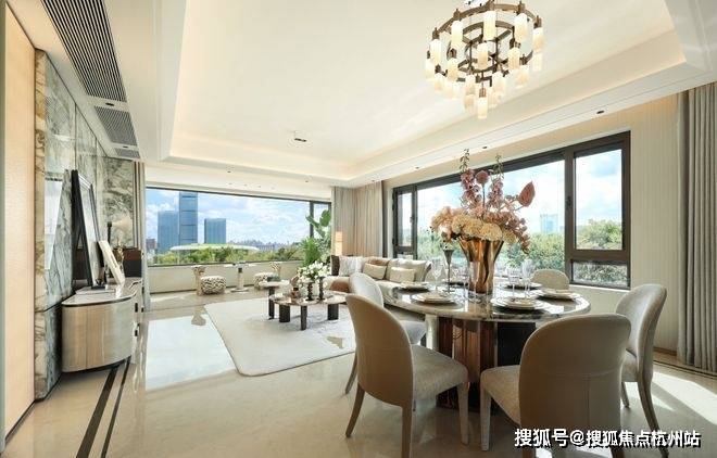 客餐尺度达约7.5米面宽,270°极致环幕窗景,实现了三面采光,无论在客厅、餐厅还是书房,葱郁园景皆如流动画卷,成为空间的主角。