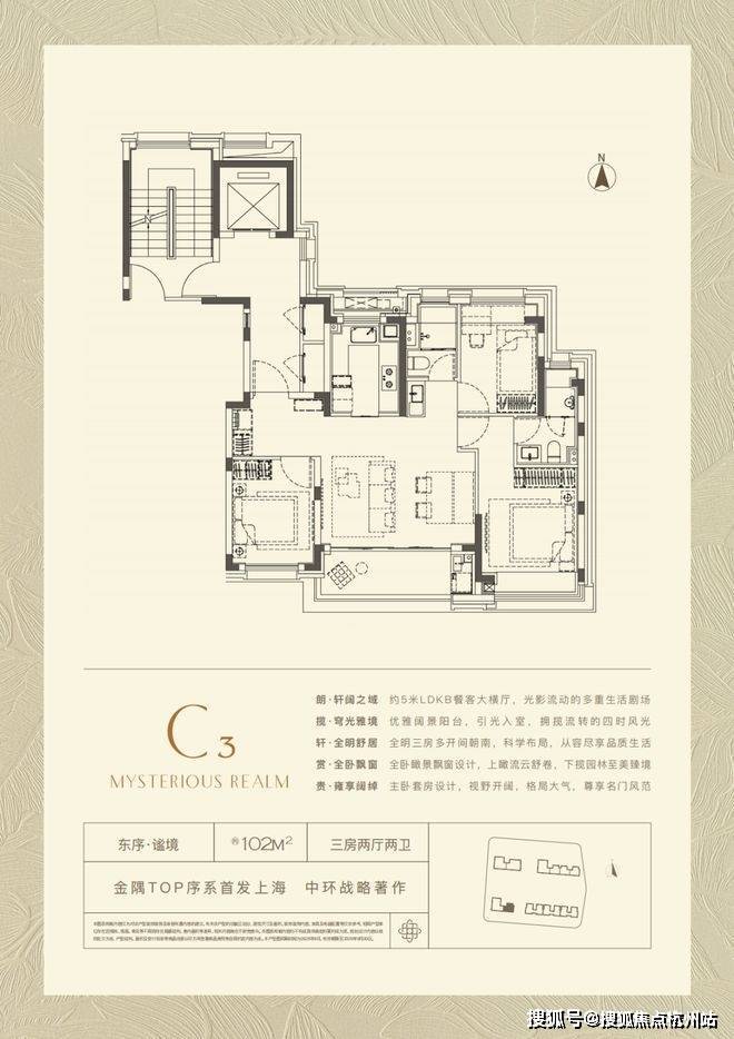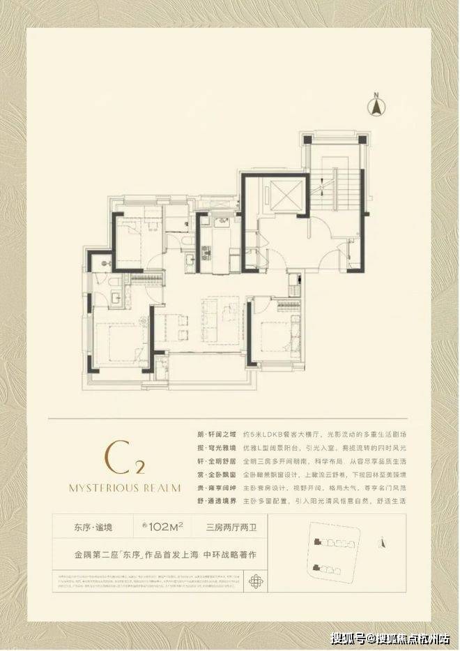 约102㎡的全明户型,三房两厅两卫格局,设计同样巧妙。