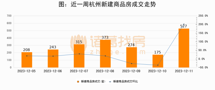 根据杭州市住房保障和房产管理局数据显示,2023年12月11日杭州新建商品房成交527套,较昨日增加352套,环比上涨201.1%