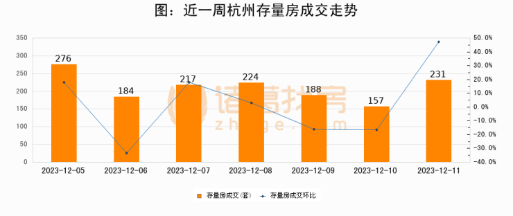 从存量房来看,2023年12月11日杭州存量房单日成交231套,比昨日增加74套,环比上涨47.1%。从近一周存量房成交来看,杭州存量房日均成交套数为211套,12月11日单日成交231套,高于近一周平均水平9.5%。