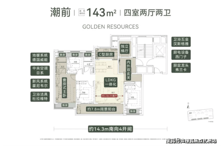 在建筑面积约143㎡湖景森奢大宅美学样板中,可以看到这个户型有着约14.3米南向四开间,约7.8米双联跑道式阳台和约4.8米会客横厅,公共区域实现创新LDKG一体化设计,形成无边界家庭社交空间,更遵循时代人物的生活习惯,打造星级主卧套间。又于室内精装上,从玄关到餐客,从厨房到卫浴,再到卧室,精研五大人性化奢居系统,奢配德国威能地暖、日立中央空调、霍尼韦尔新风系统品牌三大件,更添加世纪金源项目特有的腾云智家智能面板,引领家居智能化。