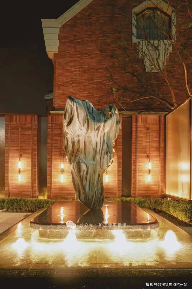 挑高金属雨棚采用极细边,中间凿壁采用透光奢石,搭配极具现代主义的雕塑彰显小区档次,背景墙面采用维多利亚黑大理石,奢华且低调。