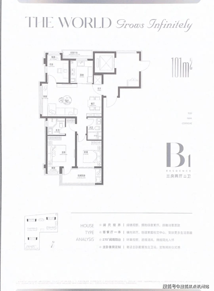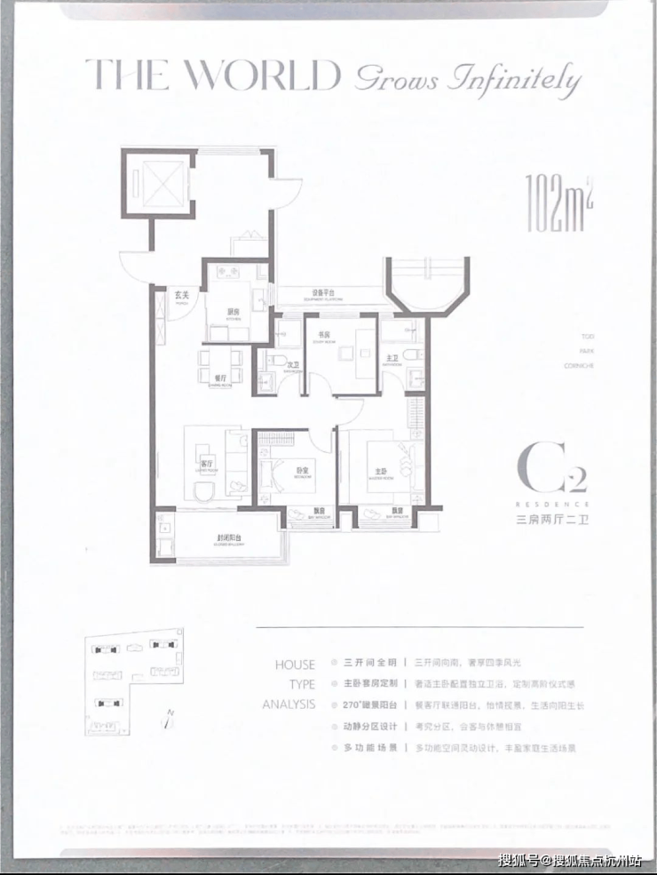 103㎡三房两卫:客餐厅一体化,270° 转角阳台,主卧套房,适合三口之家。
