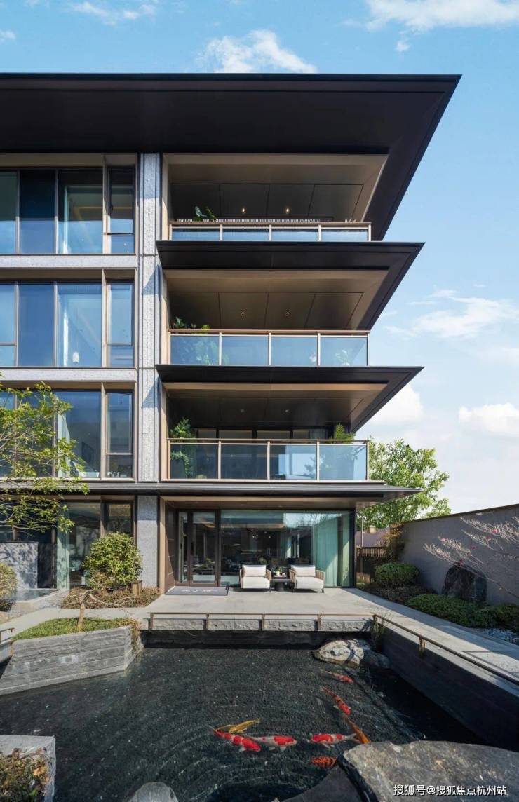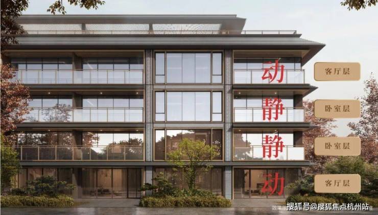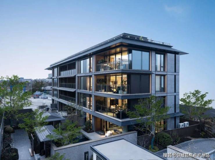 轻盈飞檐、错落戗角,承载江南建筑的雅致韵味,通透玻璃幕墙、沉稳石材肌理,注入当代居住的简约质感。