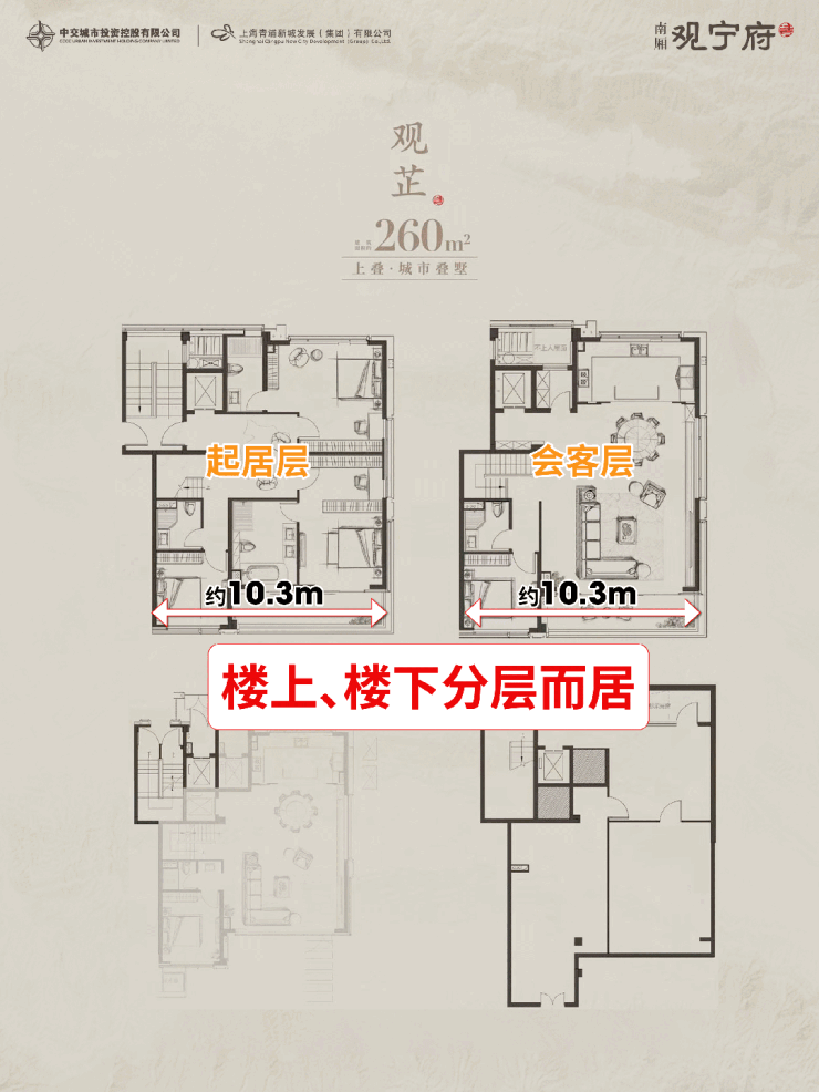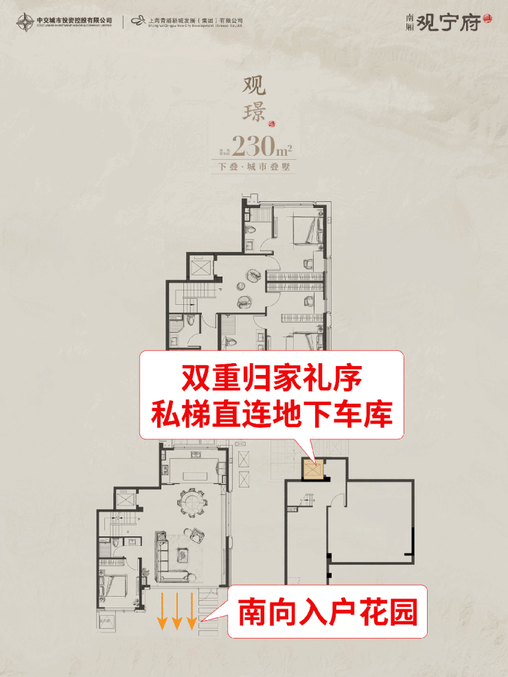 南厢观宁府 颠覆性创新户型设计, 打破传统叠墅 “下静上动” 固有分区,创新将连接上、下叠的两层核心区规划为静谧休憩层,将面向花园的下叠首层与拥有开阔视野的上叠顶层设为动感社交区。