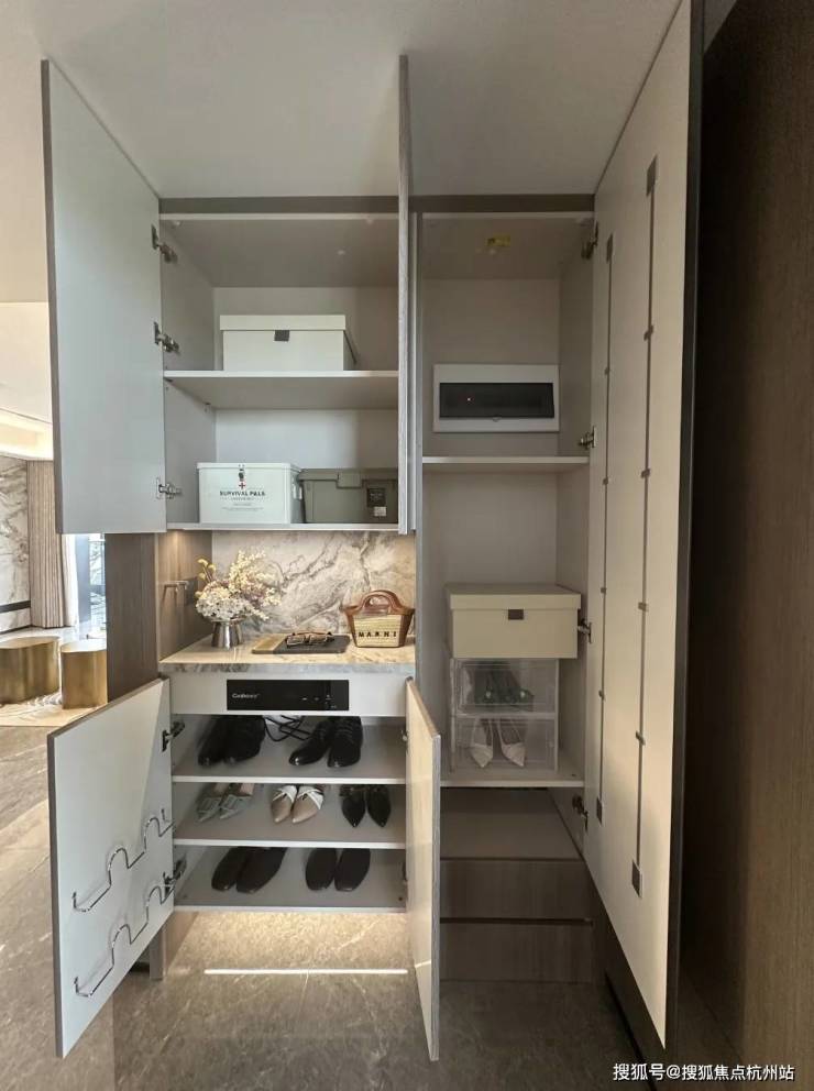 建面约144㎡洋房,一梯两户,电梯双开门,玄关位置,单独做有储藏空间,可以将大件的行李箱、滑板车等等置入: