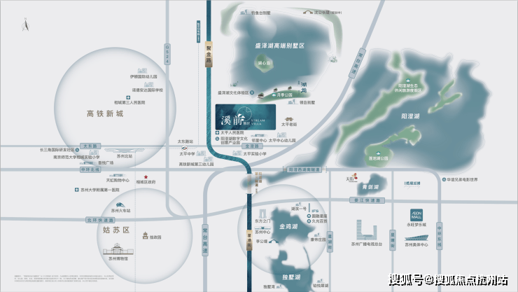 战略定位 :项目位于相城区聚金路与渭泾塘路交汇处,紧邻高铁新城北拓展区,作为苏州"北拓战略"重要节点,直接承接高铁新城核心区资源外溢,定位为"生态宜居中心"。板块依托盛泽湖、阳澄湖双湖资源,打造苏州北部"双湖"生活圈,未来将融入高铁新城"双中心"发展模式,区域能级持续提升。