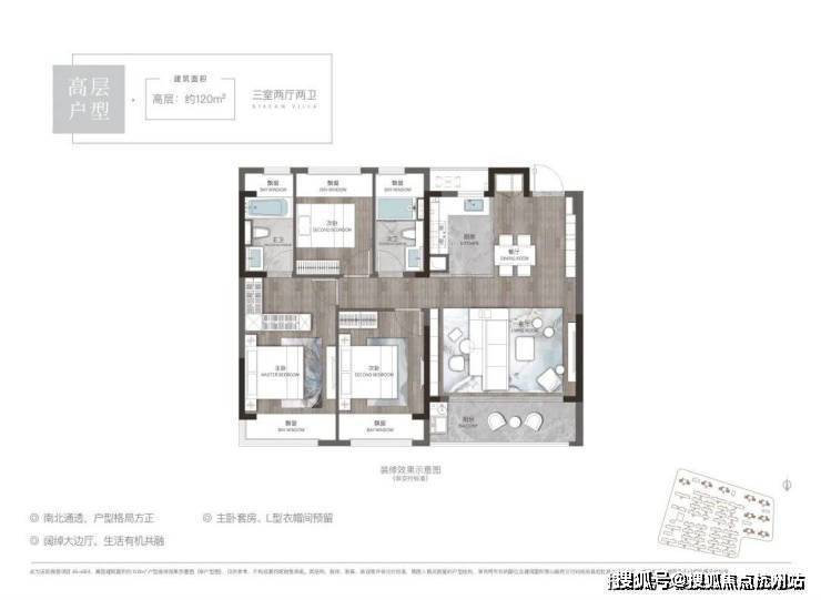 高层120平户型:三室两厅两卫,总价188万-200万