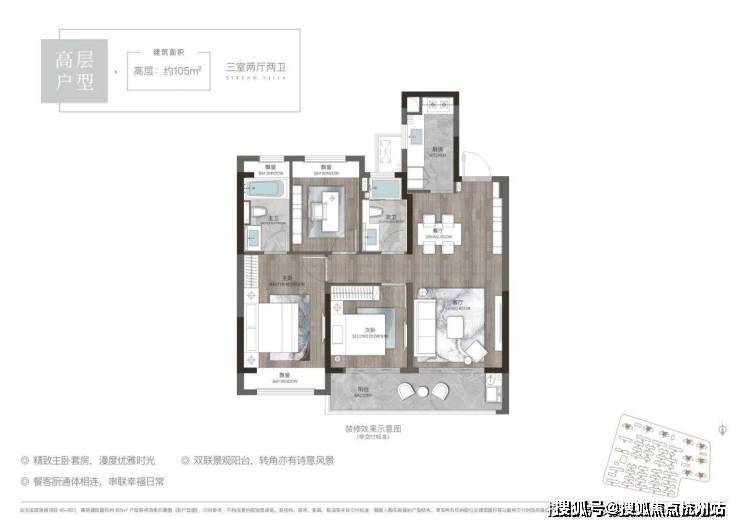 高层105平户型:三室两厅两卫,总价158万-170万