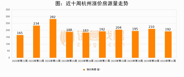 从调价房源来看,第31周杭州涨价房源192套,较上周下降8.6%。与此同时,31周涨价房源占比提升0.27个百分点,业主信心持续恢复。