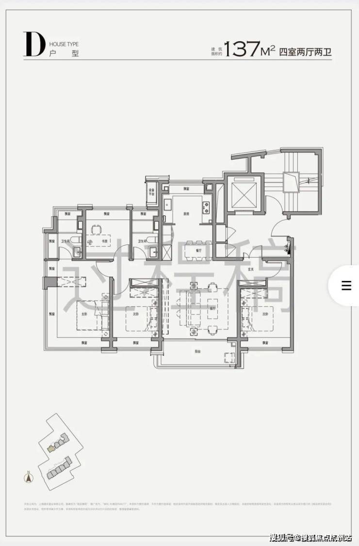 建面约137㎡的4房户型,在同等面积下实现了更精巧的功能布局,标配入户玄关,客餐厅、厨房、阳台一线贯通,家政间,通透感十足270°全景舱设计是项目一大亮点,部分户型通过北/南/西三向展开近36米连续玻璃幕墙,西南向无遮挡,城市与公园景一览无余
