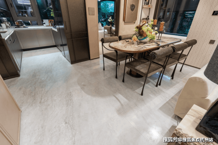 当下在顶豪里流行的弧形元素,项目也全部采用,幻日流光岩板、柳叶拼/鱼骨拼地板、踢脚线、吊顶等,“弧线拉满”,势必要给业主顶豪的居住体验: