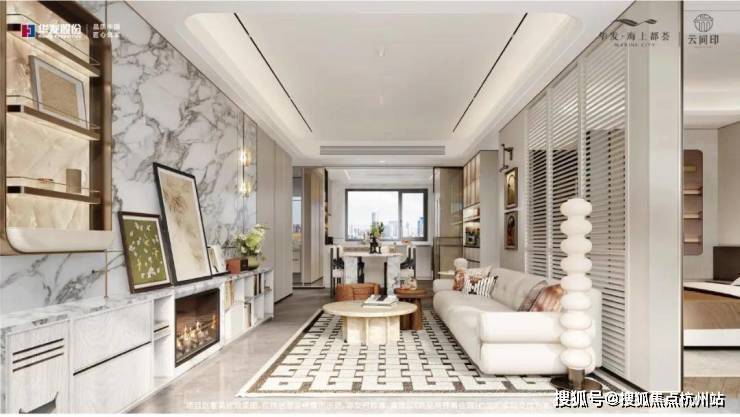 六重·澜亭之奢,约15米漂浮客厅。作为东赏水院灵韵,南望艺境连廊的观景中心,采用威尼斯棕岩板纹理,搭配金属、质感墙面,会客之中尽享艺术精粹尽显奢阔气度。成就高端私密会客的理想之境,融汇自然与艺术精粹。