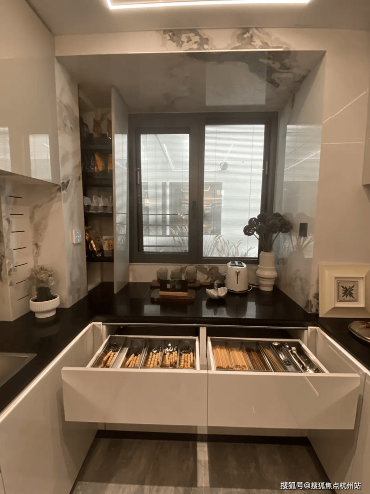 餐厅靠墙布置了通高餐边柜,极致收纳,分层合理。人体工学设计,台面高度合理,在使用过程中不需要弯腰;移动电力轨道可满足台面自由布置各种厨电,高度预留充足,能放下专业级咖啡机。顶柜可作为酒柜、玻璃杯架,底柜设计托盘式抽屉,满足多样餐具收纳。