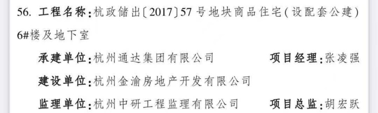 2021年4月,杭州市城乡建设委员会公布了2020年度杭州市建设工程“西湖杯”奖(优质工程)获奖名单。其中,由碧桂园集团投资开发,通达集团有限公司承建的杭政储出(2017)57号地块商品住宅,即碧桂园尚合府项目6#楼及地下室在列。