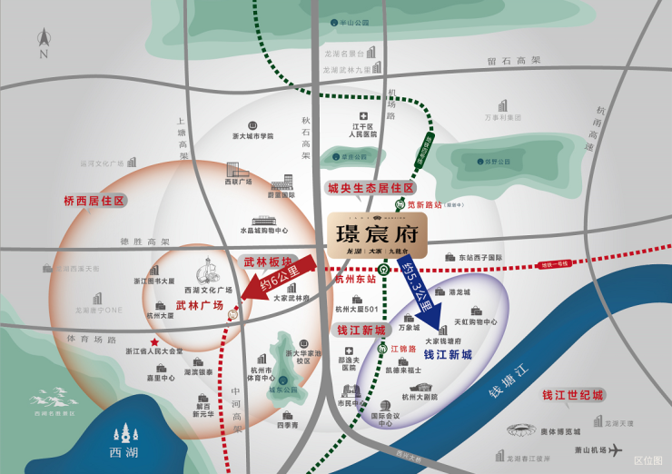 主城区位不仅是交通的便捷,还有配套的完善,璟宸府周边“一街一中心”十字天幕特色街区及白石会展中心交汇相映,华润万象汇、王府井、西子国际商圈环伺;更有约15万㎡综合体为邻。不仅如此,项目北侧规划有约9000亩江干郊野公园,项目2km处浙大二院落定,完善的配套升级,将近一步成就项目未来的居住价值。