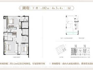 叠墅产品主力建面约 182-206㎡,分为下叠、中叠与上叠,精装交付,均价约 4.2 万 /㎡,总价约 604-800 万,得房率约 92%。182㎡下叠四房三厅四卫,格局方正,南北通透,全明采光,一层老人房设计,贴心便捷;客餐厅连通南向庭院,拓展户外休闲空间;二层双套房设计,独立卫浴保障私密性;三层主卧大套房,配备独立卫浴、衣帽间与星空露台,奢华体验;地下双层空间,层高约 5.3 米,可打造私家会所、酒窖、健身房等,拓展生活场景,实得率超 200%。