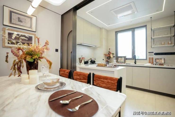 上江南贤庐售楼处电话☎:400-998-9694✔✔厨房配置中央空调,操作台面配置轨道插座,岛台台面安装升降插座,方便随时添置小家电,甚至插座上面还是一个无线充电面板。