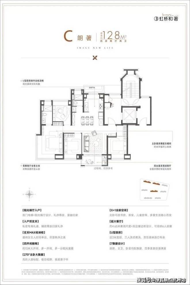 过去很长一段时间,由于土地端7090政策限制,新房产品绝大部分以百平米左右刚需产品为主,而保利虹桥和著此次将推出建面约128㎡稀缺舒适四房,本身就是一次难得的改善机遇,更何况该户型设计非常亮眼,四开间朝南设计,尽可能将更多阳光引入室内,主卧270度飘窗+南北通透大套房设计,同级别户型中十分罕见,充分满足舒适度和身份感。