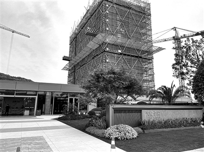 洋房基本结顶,并拆掉了绿色脚手架,目测准备进行外立面施工;3幢高层也已拔地而起。售楼部现场大门紧闭。透过玻璃看到,沙盘被白布遮盖了起来。