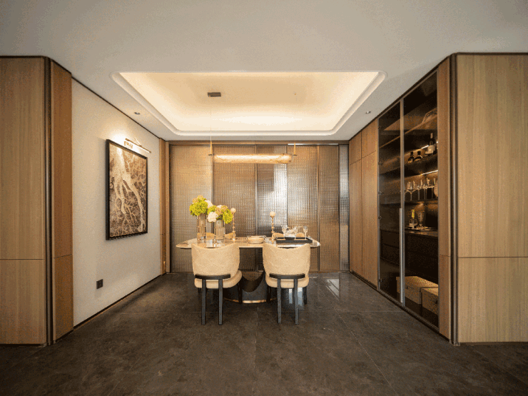 整个入户、客餐厅等区域均采用大面积木饰面装饰,自然的木质纹理给予了空间自然的感受,提供了松弛感的生活环境。