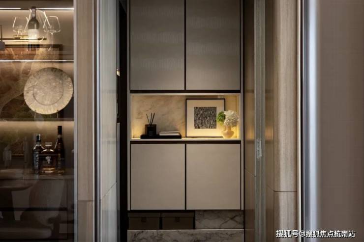 入户玄关,采用黄金白玉的台面,打开灯光立马呈现出宫廷的视觉感,配上BV式的皮革包边,顶豪的即视感也不过如此。
